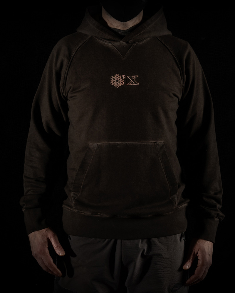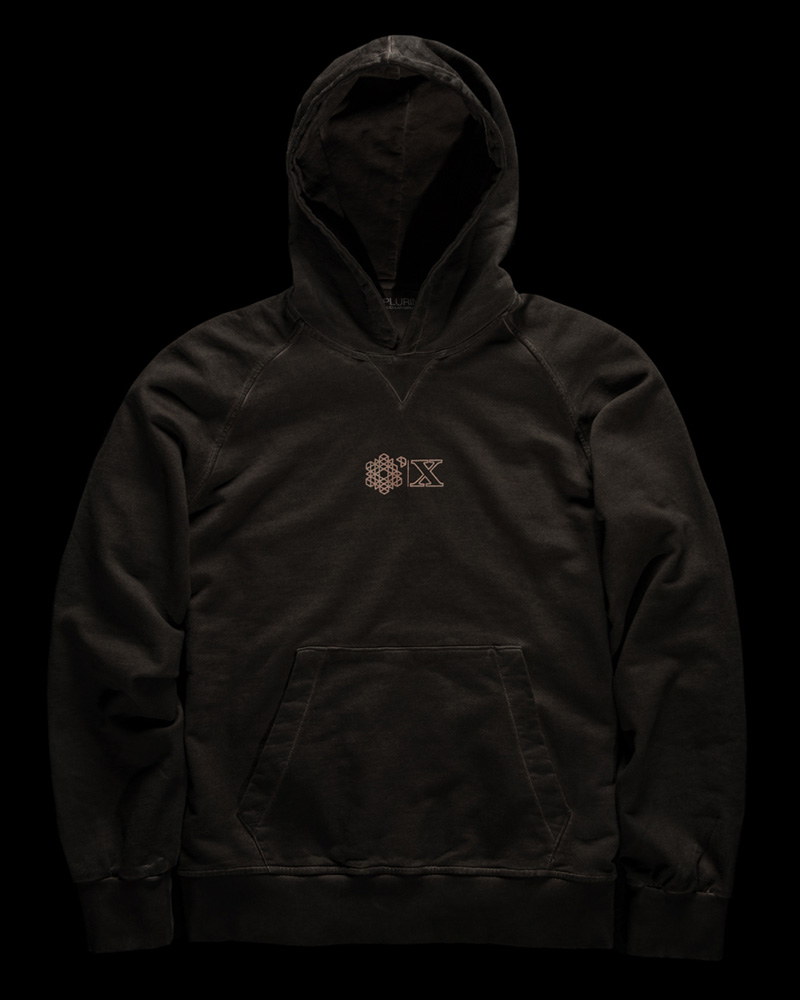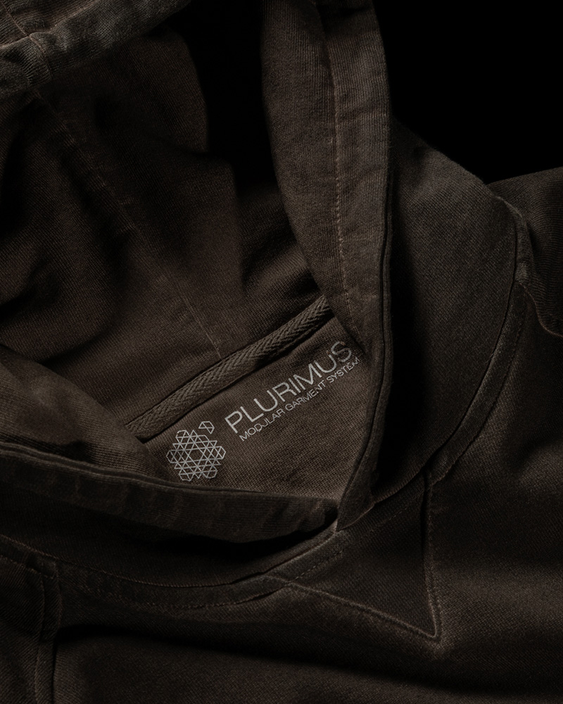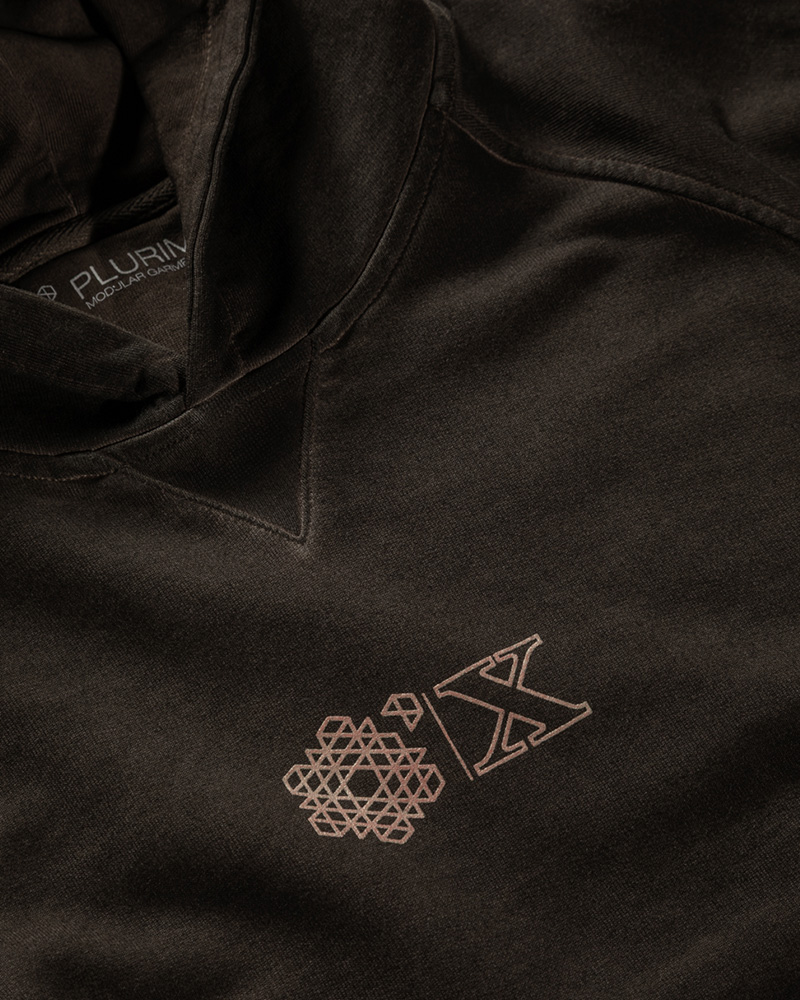 Tinto Freddo dyed Plurimus hooded sweat-shirt with front pouch pocket in 290 grams cotton in Dark Chocolate Brown with Dusty Pink Plurimus and X Anniversary logo screen-print on chest.